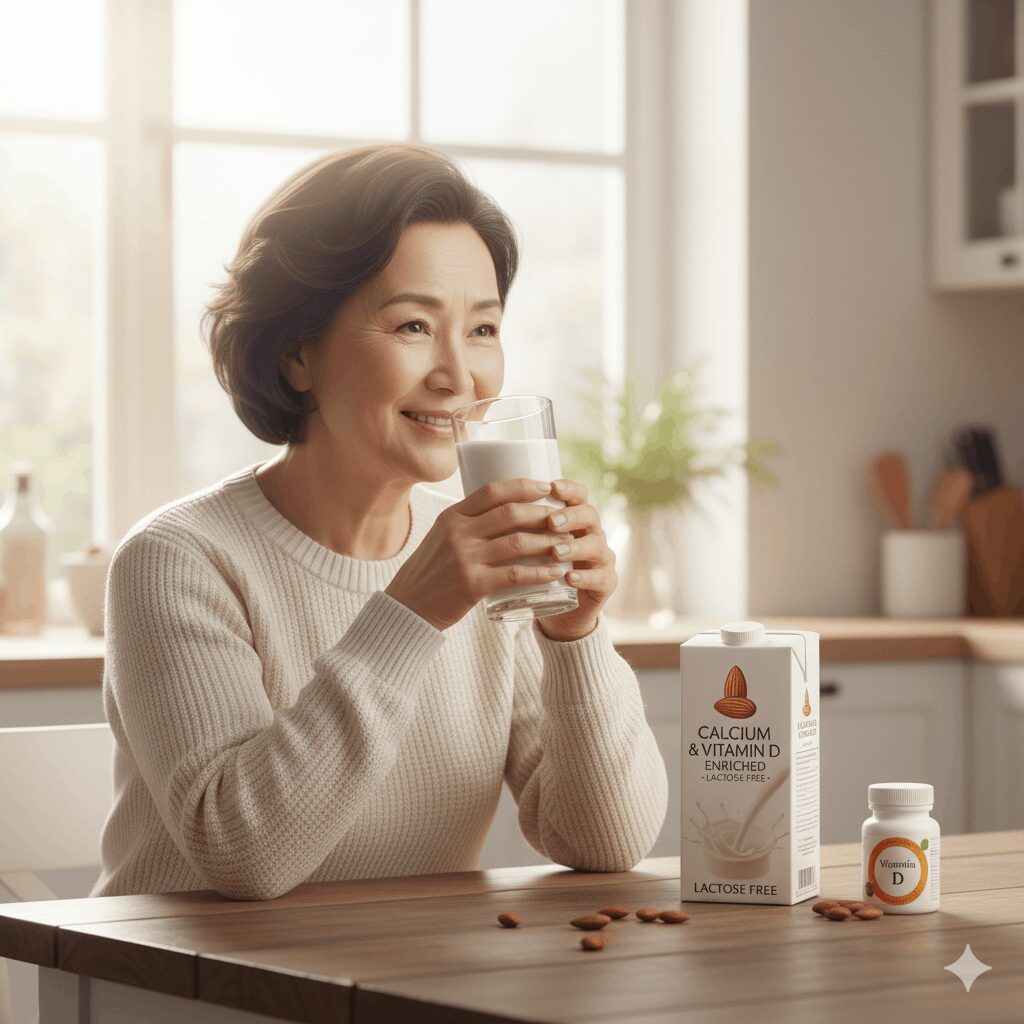 강화 제품은 칼슘과 비타민 D가 풍부합니다. 유제품을 소화하기 어려운 분들에게 훌륭한 대안이 되죠. 이 두 영양소는 골다공증 예방에 필수적이에요.
